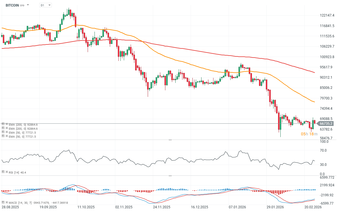 Bitcoin po nedávných poklesech konsoliduje v úzkém pásmu mezi 60 000 a 70 000 USD. Včerejší test horní hranice této konsolidace skončil vítězstvím prodejců, což podtrhuje strukturální slabost kryptoměnového trhu.