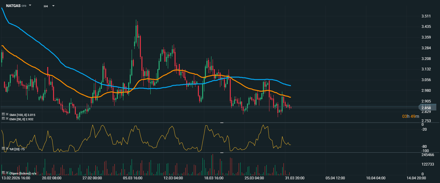 Cena zemního plynu se aktuálně pohybuje okolo 2,858 USD a drží se těsně nad důležitou supportní zónou v oblasti 2,83–2,85 USD. Trh se zároveň nachází pod EMA 50 na úrovni 2,932 USD i pod SMA 100 na hodnotě 3,015 USD, což potvrzuje převahu prodejců a pokračující medvědí technické nastavení ve střednědobém horizontu. Vývoj v posledních dnech ukazuje, že každé růstové nadechnutí bylo zatím pouze krátkodobé a cena nedokázala udržet pohyb nad klouzavými průměry. Právě oblast kolem 2,93 USD nyní představuje nejbližší rezistenci, zatímco pásmo kolem 3,01 USD je ještě významnější bariérou pro případné obratové scénáře. Dokud zůstane zemní plyn pod těmito úrovněmi, trh bude nadále působit slabě.