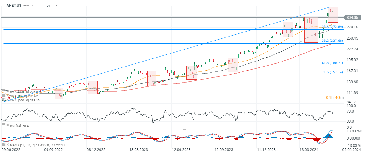 Kupující se rychle vrátili k nákupu akcií ANET. Na grafu vidíme svíčku s vysokým spodním stínem tzv. vážky doji. Klíčové supporty se nacházejí na úrovni 272 a 237 dolarů za akcii.