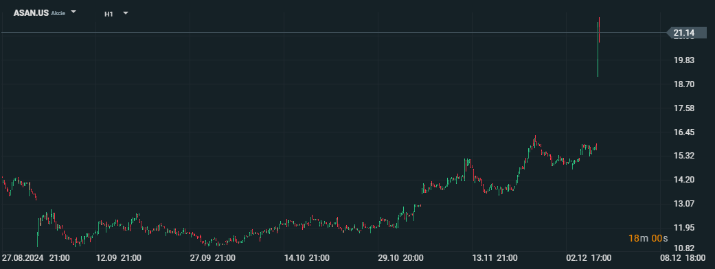 Společnost Asana Inc. (NYSE: ASAN), přední poskytovatel softwaru pro řízení práce, zaznamenala dnes růst svých akcií o 38 % a uzavřela na hodnotě 21,26 USD. Dramatický nárůst následoval po lepších než očekávaných výsledcích za 3. čtvrtletí fiskálního roku 2025 a zvýšeném výhledu tržeb, což signalizuje obnovenou důvěru investorů.