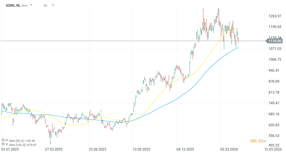 Z pohledu vývoje ceny akcií je ASML letos zatím v zelených číslech. Od začátku roku akcie připisují přes 13 % a za poslední rok vzrostly o více než 100 %. Po dosažení maxim v roce 2024 nad hranicí 1 000 eur se akcie propadly až k úrovni 500 eur. Současná maxima byla dosažena v únoru 2026, kdy se akcie poprvé dostaly nad 1 300 eur. Ze svých maxim už titul ztratil přes 14 %.