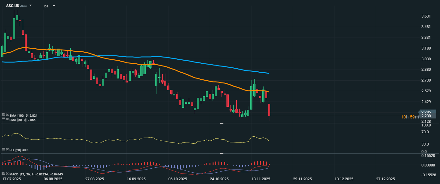 Akcie společnosti Asos zaznamenaly po zveřejnění slabých výsledků prudký pokles a aktuálně se obchodují na ceně 2,23 GBP, což je hluboko pod oběma klouzavými průměry – EMA 50 na úrovni 2,565 GBP a SMA 100 na úrovni 2,824 GBP. Tato skutečnost potvrzuje setrvalý sestupný trend, ve kterém se akcie nacházejí. RSI osciluje kolem hodnoty 40,5, tedy těsně nad hranicí přeprodanosti, což ukazuje na pokračující prodejní tlak, ale stále s určitou rezervou pro další pokles.