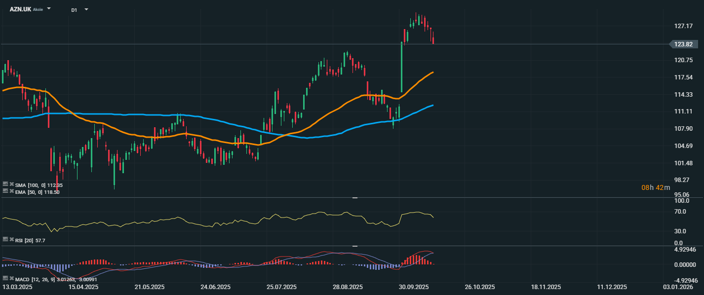 Akcie společnosti AstraZeneca se v posledních týdnech obchodovali v býčím trendu. Po prudkém růstu však došlo k mírné konsolidaci, přičemž aktuálně testují úroveň 123,82 GBP. Cena akcií se stále drží výrazně nad EMA 50 (118,50 GBP) i SMA 100 (112,55 GBP). Důležitou úrovní podpory pro případnou korekci bude oblast kolem EMA 50 (118,50 GBP). Pokud se cena udrží nad touto hladinou, zůstává pozitivní technický výhled zachován. Naopak průraz pod ni by mohl otevřít prostor k otestování 115–112 GBP.