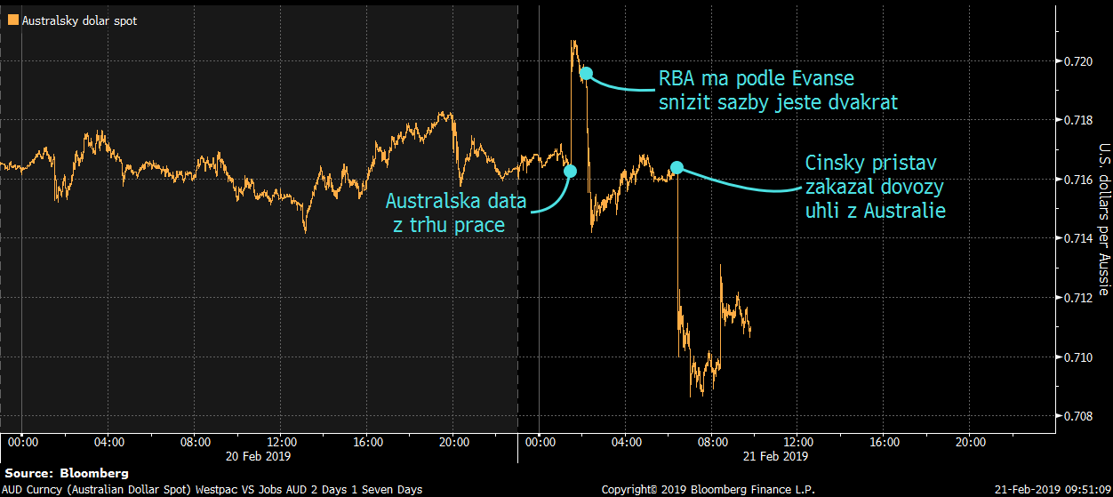 Růstové momentum ale nevydrželo dlouho. Už necelou hodinu poté, jej "zaříznul" hlavní ekonom Westpac Banking Corp. Bill Evans, který uvedl, že by australská centrální banky mohla letos snížit sazby až dvakrát. Krátce před půl sedmou pak AUD potopil report agentury Bloomberg, která včera upozornila na to, že Čína omezuje dovozy uhlí z Austrálie, aby dnes ráno informovala o tom, že jeden z nejvýznamnějších čínských přístavů na severu země (Dalian) importy uhlí kompletně přerušil.