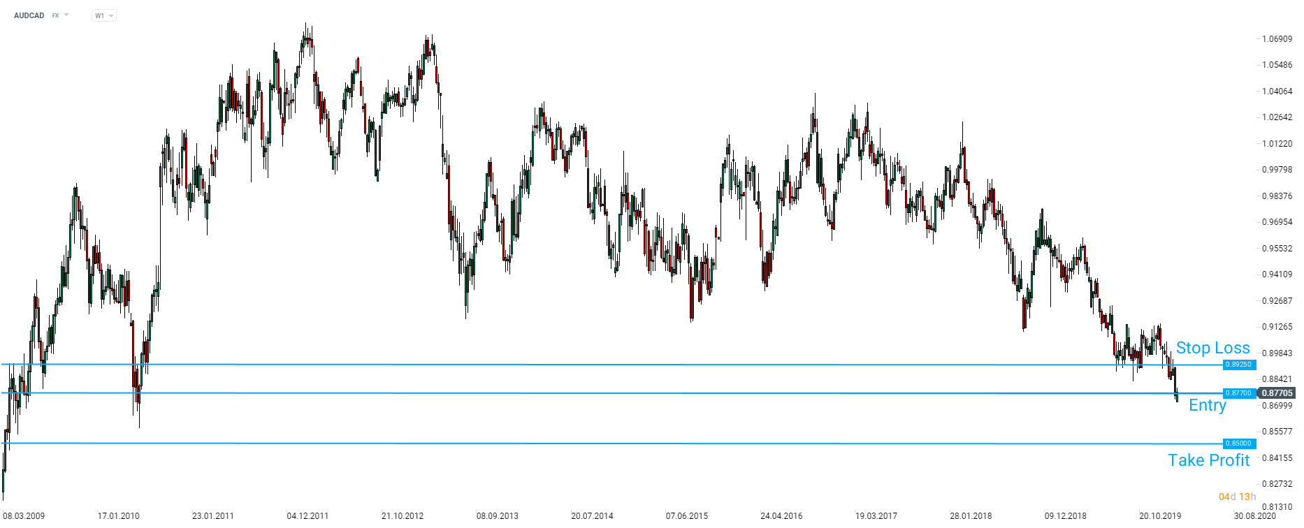 Nordea odporúča zaujať krátku pozíciu na trhu AUDCAD za trhovú cenu s cieľom na úrovni 0,8500 a príkazom na zastavenie straty na hladine 0,8925. Zdroj: xStation5