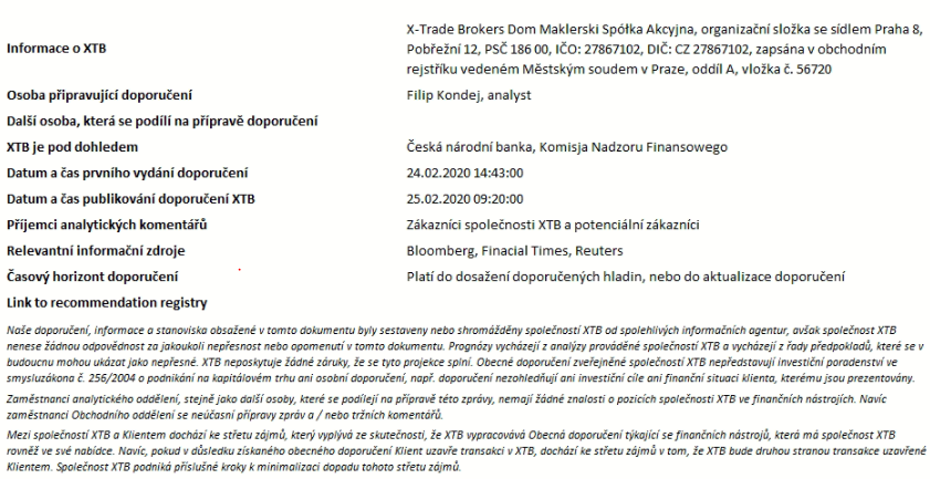 Rozdílové smlouvy jsou komplexní nástroje a v důsledku použití finanční páky jsou spojeny s vysokým rizikem rychlého vzniku finanční ztráty. U 71 % účtů retailových investorů došlo při obchodování s rozdílovými smlouvami u tohoto poskytovatele ke vzniku ztráty. Měli byste zvážit, zda rozumíte tomu, jak rozdílové smlouvy fungují, a zda si můžete dovolit vysoké riziko ztráty svých finančních prostředků. Investování je rizikové. Investujte zodpovědně. Tento materiál je marketingovou komunikací ve smyslu čl. 24 odst. 3 směrnice Evropského parlamentu a Rady 2014/65/EU ze dne 15. května 2014 o trzích finančních nástrojů, kterou se mění směrnice 2002/92/ES a směrnice 2011/61/EU (MiFID II). Marketingová komunikace není investiční doporučení ani informace doporučující či navrhující investiční strategii ve smyslu nařízení Evropského parlamentu a Rady (EU) č. 596/2014 ze dne 16. dubna 2014 o zneužívání trhu (nařízení o zneužívání trhu) a o zrušení směrnice Evropského parlamentu a Rady 2003/6/ES a směrnic Komise 2003/124/ES, 2003/125/ES a 2004/72/ES a nařízení Komise v přenesené pravomoci (EU) 2016/958 ze dne 9. března 2016, kterým se doplňuje nařízení Evropského parlamentu a Rady (EU) č. 596/2014, pokud jde o regulační technické normy pro technická ujednání pro objektivní předkládání investičních doporučení nebo jiných informací doporučujících nebo navrhujících investiční strategie a pro zveřejnění konkrétních zájmů nebo náznaků střetu zájmů nebo jakékoli jiné rady, a to i v oblasti investičního poradenství, ve smyslu zákona č. 256/2004 Sb., o podnikání na kapitálovém trhu. Marketingová komunikace je připravena s nejvyšší pečlivostí, objektivitou, prezentuje fakta známé autorovi k datu přípravy a neobsahuje žádné hodnotící prvky. Marketingová komunikace je připravena bez zohlednění potřeb klienta, jeho individuální finanční situace a nijak nepředstavuje investiční strategii. Marketingová komunikace nepředstavuje nabídku k prodeji, nabídku, předplatné, výzvu na nákup, reklamu nebo propagaci jakýchkoliv finančních nástrojů. Společnost XTB S.A., organizační složka nenese odpovědnost za jakékoli jednání nebo opomenutí klienta, zejména za získání nebo zcizení finančních nástrojů, na základě informací obsažených v této marketingové komunikaci. V případě, že marketingová komunikace obsahuje jakékoli informace o jakýchkoli výsledcích týkajících se finančních nástrojů v nich uvedených, nepředstavují žádnou záruku ani předpověď ohledně budoucích výsledků. Minulá výkonnost nemusí nutně vypovídat o budoucích výsledcích a každá osoba jednající na základě těchto informací tak činí zcela na vlastní riziko.