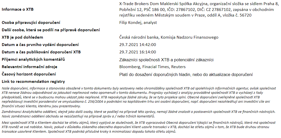 Rozdílové smlouvy jsou komplexní nástroje a v důsledku použití finanční páky jsou spojeny s vysokým rizikem rychlého vzniku finanční ztráty. U 71 % účtů retailových investorů došlo při obchodování s rozdílovými smlouvami u tohoto poskytovatele ke vzniku ztráty. Měli byste zvážit, zda rozumíte tomu, jak rozdílové smlouvy fungují, a zda si můžete dovolit vysoké riziko ztráty svých finančních prostředků. Investování je rizikové. Investujte zodpovědně. Tento materiál je marketingovou komunikací ve smyslu čl. 24 odst. 3 směrnice Evropského parlamentu a Rady 2014/65/EU ze dne 15. května 2014 o trzích finančních nástrojů, kterou se mění směrnice 2002/92/ES a směrnice 2011/61/EU (MiFID II). Marketingová komunikace není investiční doporučení ani informace doporučující či navrhující investiční strategii ve smyslu nařízení Evropského parlamentu a Rady (EU) č. 596/2014 ze dne 16. dubna 2014 o zneužívání trhu (nařízení o zneužívání trhu) a o zrušení směrnice Evropského parlamentu a Rady 2003/6/ES a směrnic Komise 2003/124/ES, 2003/125/ES a 2004/72/ES a nařízení Komise v přenesené pravomoci (EU) 2016/958 ze dne 9. března 2016, kterým se doplňuje nařízení Evropského parlamentu a Rady (EU) č. 596/2014, pokud jde o regulační technické normy pro technická ujednání pro objektivní předkládání investičních doporučení nebo jiných informací doporučujících nebo navrhujících investiční strategie a pro zveřejnění konkrétních zájmů nebo náznaků střetu zájmů nebo jakékoli jiné rady, a to i v oblasti investičního poradenství, ve smyslu zákona č. 256/2004 Sb., o podnikání na kapitálovém trhu. Marketingová komunikace je připravena s nejvyšší pečlivostí, objektivitou, prezentuje fakta známé autorovi k datu přípravy a neobsahuje žádné hodnotící prvky. Marketingová komunikace je připravena bez zohlednění potřeb klienta, jeho individuální finanční situace a nijak nepředstavuje investiční strategii. Marketingová komunikace nepředstavuje nabídku k prodeji, nabídku, předplatné, výzvu na nákup, reklamu nebo propagaci jakýchkoliv finančních nástrojů. Společnost XTB S.A., organizační složka nenese odpovědnost za jakékoli jednání nebo opomenutí klienta, zejména za získání nebo zcizení finančních nástrojů, na základě informací obsažených v této marketingové komunikaci. V případě, že marketingová komunikace obsahuje jakékoli informace o jakýchkoli výsledcích týkajících se finančních nástrojů v nich uvedených, nepředstavují žádnou záruku ani předpověď ohledně budoucích výsledků. Minulá výkonnost nemusí nutně vypovídat o budoucích výsledcích a každá osoba jednající na základě těchto informací tak činí zcela na vlastní riziko.
