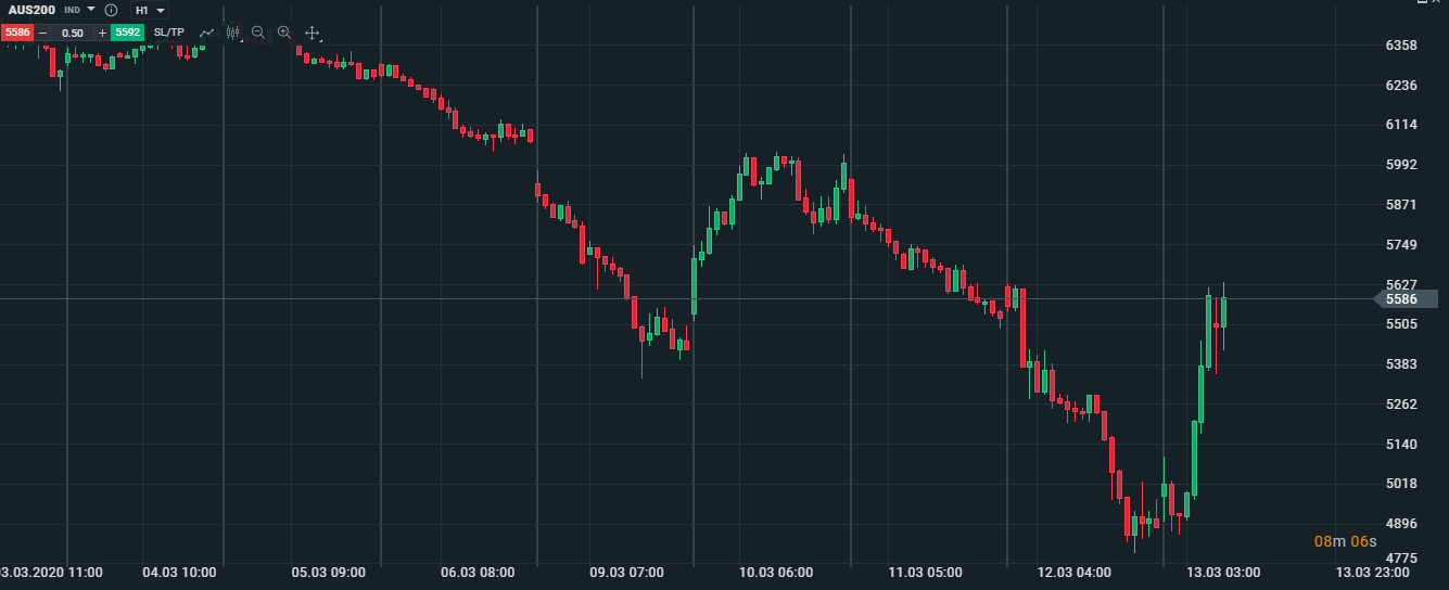 Australský akciový index S&P/ASX200 dnes ráno vzrostl během čtyř hodin o přibližně 13 %. Po prvotním kolapsu, kdy v jednu chvílí ztrácel přes 8 %, následně zakončil seanci po mohutném rally na úrovni +4,4 %. Jedná se o největší intradenní růst od roku 2000, kdy byl index vytvořen. Index tak během pár hodin kompletně zlikvidoval své ztráty ze včerejší seance.