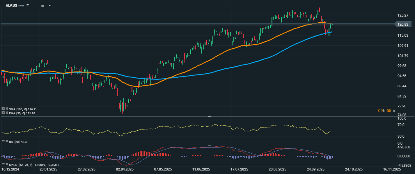 Akcie společnosti Autoliv se po krátkodobém poklesu odrazily zpět a aktuálně se obchodují na úrovni 120,83 USD. Cena se momentálně pohybuje mezi klouzavými průměry – EMA 50 (121,10 USD) a SMA 100 (116,91 USD), což značí fázi přechodného konsolidačního pohybu po silném růstovém trendu z předchozích měsíců. RSI osciluje na hodnotě 48,3, tedy poblíž neutrální zóny, bez známek překoupenosti či přeprodanosti. To potvrzuje vyčkávací postoj investorů a absenci výraznějšího směrového impulsu.