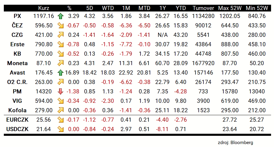 Hlavní index pražské burzy PX (CZKCASH) se svým růstem dnes výrazně oddělil od dění v západní Evropě, kde indexy krátce před závěrem předvádějí výrazné ztráty. PX přidal 3,29 % a uzavřel na úrovni 1 197,16 bodů. Index navýšil své nejvyšší úrovně od roku 2011. Obchodované objemy dosáhly na masivních 1,2 mld. korun.