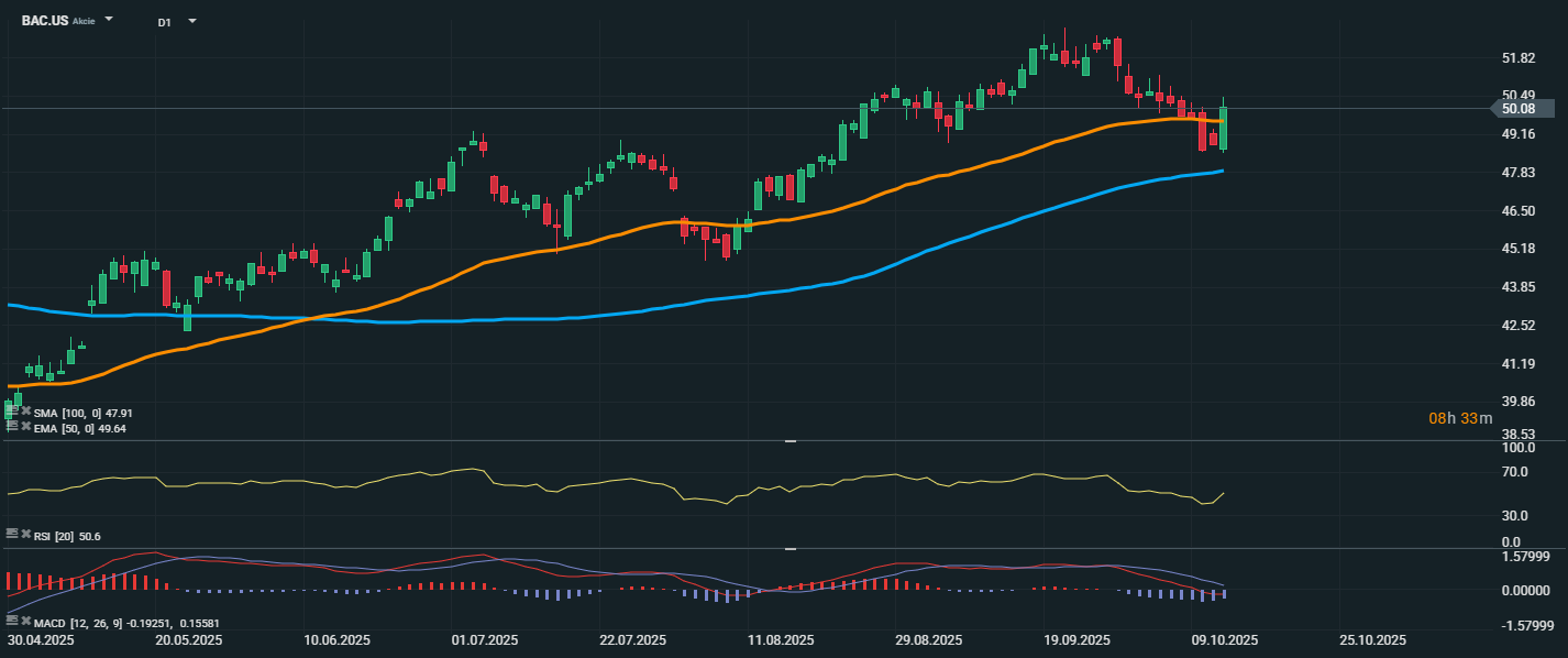 Akcie Bank of America po několika dnech poklesu opět posilují a aktuálně se obchodují na úrovni 50,08 USD, čímž proráží nad EMA 50 (49,64 USD) a SMA 100 (47,91 USD). RSI se nachází na úrovni 50,6, tedy přesně v neutrální zóně, což naznačuje, že trh má stále prostor pro další pohyb bez známek překoupenosti. Pokud se cena udrží nad 50 USD, může být dalším cílem návrat k předchozím maximům. Naopak pokles zpět pod EMA 50 by mohl vyvolat další tlak na pokles a znovu otevřít prostor k testu hladiny SMA 100.