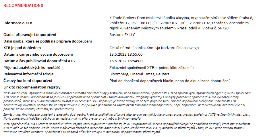 Rozdílové smlouvy jsou komplexní nástroje a v důsledku použití finanční páky jsou spojeny s vysokým rizikem rychlého vzniku finanční ztráty. U 71 % účtů retailových investorů došlo při obchodování s rozdílovými smlouvami u tohoto poskytovatele ke vzniku ztráty. Měli byste zvážit, zda rozumíte tomu, jak rozdílové smlouvy fungují, a zda si můžete dovolit vysoké riziko ztráty svých finančních prostředků. Investování je rizikové. Investujte zodpovědně. Tento materiál je marketingovou komunikací ve smyslu čl. 24 odst. 3 směrnice Evropského parlamentu a Rady 2014/65/EU ze dne 15. května 2014 o trzích finančních nástrojů, kterou se mění směrnice 2002/92/ES a směrnice 2011/61/EU (MiFID II). Marketingová komunikace není investiční doporučení ani informace doporučující či navrhující investiční strategii ve smyslu nařízení Evropského parlamentu a Rady (EU) č. 596/2014 ze dne 16. dubna 2014 o zneužívání trhu (nařízení o zneužívání trhu) a o zrušení směrnice Evropského parlamentu a Rady 2003/6/ES a směrnic Komise 2003/124/ES, 2003/125/ES a 2004/72/ES a nařízení Komise v přenesené pravomoci (EU) 2016/958 ze dne 9. března 2016, kterým se doplňuje nařízení Evropského parlamentu a Rady (EU) č. 596/2014, pokud jde o regulační technické normy pro technická ujednání pro objektivní předkládání investičních doporučení nebo jiných informací doporučujících nebo navrhujících investiční strategie a pro zveřejnění konkrétních zájmů nebo náznaků střetu zájmů nebo jakékoli jiné rady, a to i v oblasti investičního poradenství, ve smyslu zákona č. 256/2004 Sb., o podnikání na kapitálovém trhu. Marketingová komunikace je připravena s nejvyšší pečlivostí, objektivitou, prezentuje fakta známé autorovi k datu přípravy a neobsahuje žádné hodnotící prvky. Marketingová komunikace je připravena bez zohlednění potřeb klienta, jeho individuální finanční situace a nijak nepředstavuje investiční strategii. Marketingová komunikace nepředstavuje nabídku k prodeji, nabídku, předplatné, výzvu na nákup, reklamu nebo propagaci jakýchkoliv finančních nástrojů. Společnost XTB S.A., organizační složka nenese odpovědnost za jakékoli jednání nebo opomenutí klienta, zejména za získání nebo zcizení finančních nástrojů, na základě informací obsažených v této marketingové komunikaci. V případě, že marketingová komunikace obsahuje jakékoli informace o jakýchkoli výsledcích týkajících se finančních nástrojů v nich uvedených, nepředstavují žádnou záruku ani předpověď ohledně budoucích výsledků. Minulá výkonnost nemusí nutně vypovídat o budoucích výsledcích a každá osoba jednající na základě těchto informací tak činí zcela na vlastní riziko.