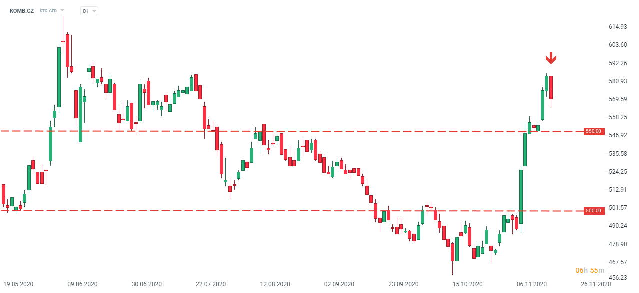 Akcie Komerční banky (KOMB.CZ) korigovaly po masivním nárůstu z první poloviny měsíce. Banka v listopadu rostla až o 23 %. I po dnešním poklesu zůstávají akcie Komerční banky v blízkosti nejvyšších úrovní od konce července. Zdroj: xStation5
