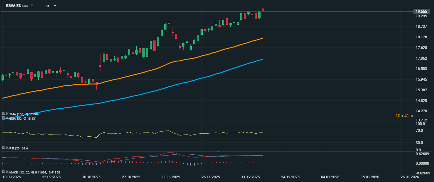 Akcie španělské banky BBVA se aktuálně obchodují na úrovni 19,55 EUR, což znamená, že cena dosáhla nového lokálního maxima. Technicky se akcie nachází v jasném býčím trendu, neboť se obchodují nad klouzavými průměry EMA 50 (18,13 EUR) a SMA 100 (17,01 EUR), které mají zároveň rostoucí sklon. RSI se pohybuje blízko překoupené zóny, což značí zvýšený nákupní zájem, ale ještě ne extrémní hodnoty.