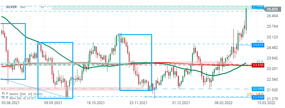 Cena stříbra jen během dnešní seance roste o 4 %. Růst akceleroval během projevu amerického prezidenta. Cena se nyní blíží psychologické úrovni $27 za unci. Zdroj: xStation5