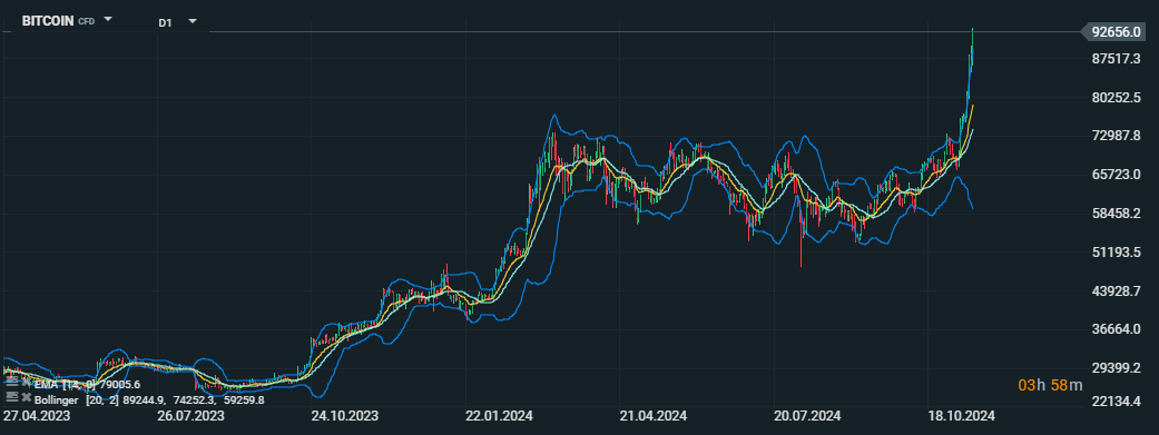 Bitcoin dosahuje nového historického maxima nad 92 000 USD s podporou EMA a Bollingerových pásem. Zdroj: xStation5