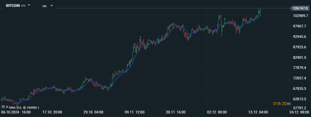 Bitcoin dosáhl nového maxima 106 747 USD, poháněn rostoucím zájmem investorů. EMA (14) ukazuje stabilní rostoucí trend. Zdroj: xStation5