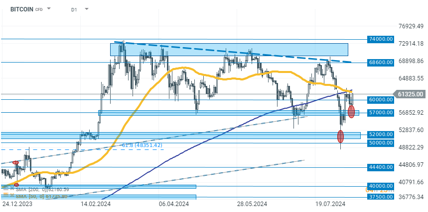 Cena bitcoinu po nedávném pullbacku prorazila z klíčové oblasti. Na grafu vidíme, že nedávný pokles pod 50 000 dolarů byl rychle vykoupen a během pouhých tří seancí se Bitcoinu podařilo vyšplhat zpět nad 60 000 dolarů. Následně pullback a nižší likvidita během víkendu stlačily cenu BTC zpět na úroveň 57 000 USD. Pro pokračování vzestupného trendu bylo klíčové další proražení supportu, které aktuálně pozorujeme.
