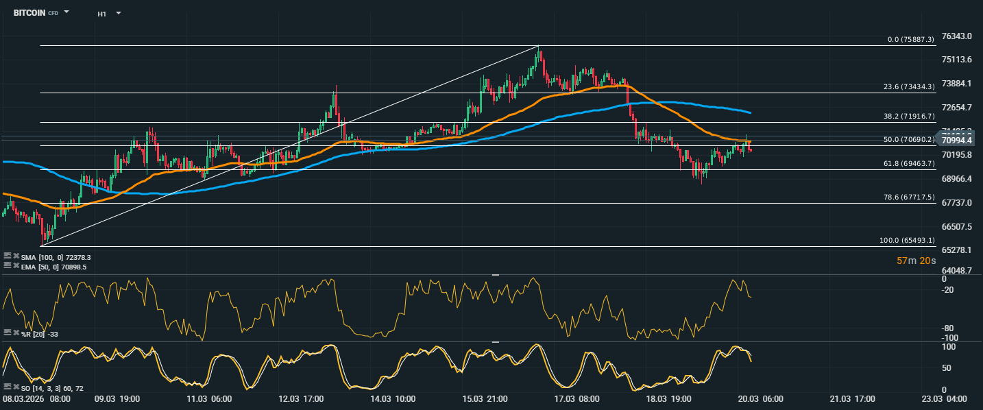 Bitcoin se obchoduje kolem 70 994 USD a po předchozím poklesu se nyní snaží stabilizovat v blízkosti 50% Fibonacciho retracementu na úrovni 70 690 USD. Cena se drží poblíž EMA 50 na hodnotě 70 898 USD, což ukazuje na krátkodobý boj mezi kupci a prodejci, avšak zároveň zůstává pod SMA 100 na úrovni 72 378 USD, která potvrzuje, že střednědobý tlak zůstává spíše negativní.
