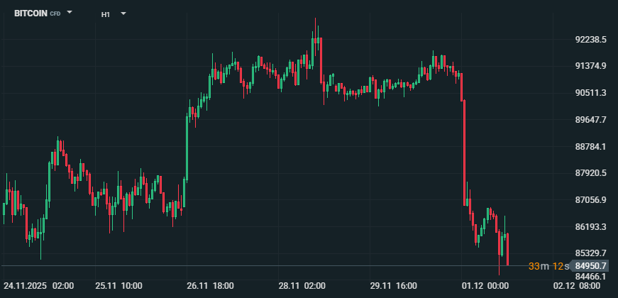 Bitcoin klesl pod 86 000 USD v rámci širšího výprodeje kryptoměn na začátku prosince 2025.