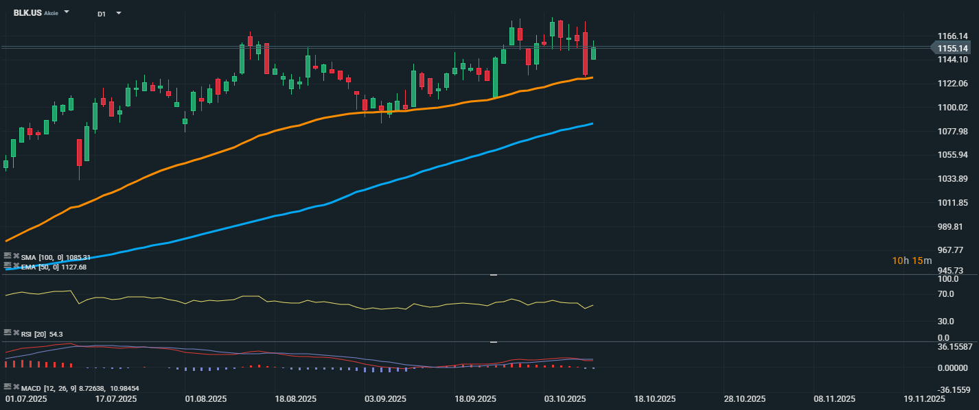 Akcie společnosti BlackRock se po zveřejnění silných kvartálních výsledků nadále pohybují v býčím trendu. Aktuální cena se nachází kolem 1 155 USD, přičemž při posledním poklesu trh respektoval podporu tvořenou klouzavým průměrem EMA 50 na úrovni 1 127,68 USD, od které se odrazil zpět vzhůru. SMA 100 (1 085,31 USD) zůstává silně rostoucí, což potvrzuje dlouhodobý růstový trend. RSI osciluje kolem hodnoty 54,3, tedy v neutrálním pásmu, což značí prostor pro další růst bez známek překoupení. MACD se drží nad nulou, a přestože linie signálu je v těsné blízkosti, zatím nedošlo k negativnímu překřížení, což potvrzuje pokračující pozitivní momentum.