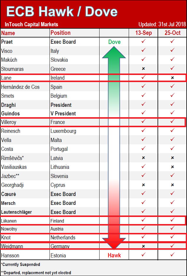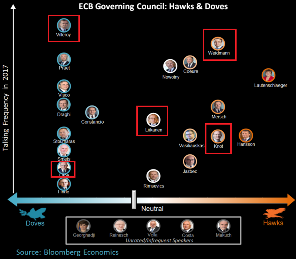 Pozrime sa aj na ďalší rebríček jastrabov-holubíc z dielne ITC Market, keďže posúdenie, či je niekto jastrab, alebo holubica, je dosť subjektívne. Tento rebríček tiež radí Weidmana a Knota medzi najväčších jastrabov. Vyššie na stupni jastrabov/holubíc však radí Likkanena. Villeroy je podľa tohto rebríčka mierna holubica a Lane zase patrí k najväčším holubiciam.