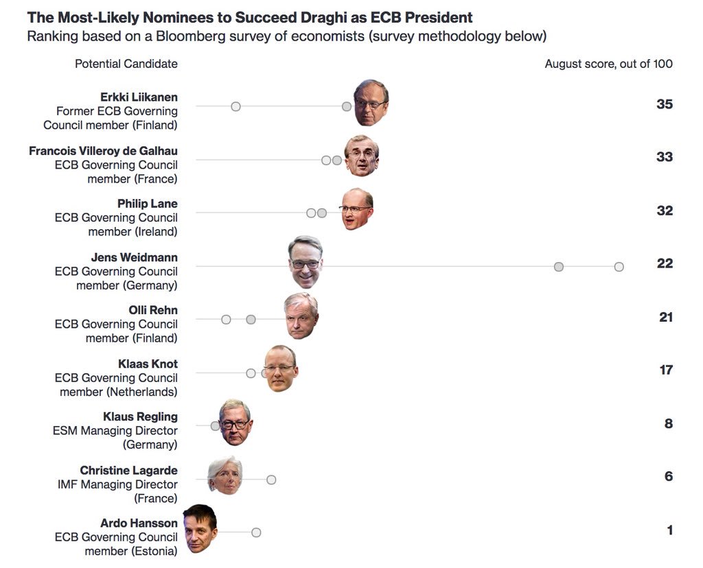 Doteraz bol s odstupom najväčším favoritom na šéfa ECB nemec Jens Weidman. To sa však po novom zmenilo. Nemecká kancelárka Merkelová sa nechala počuť, že v rámci nadchádzajúcich rokovaní o rozhodujúcich pozíciách v EÚ sa bude Nemecko usilovať o top pozíciu v rámci administratívy EÚ. Tým pádom bude pravdepodobne musieť obetovať post šéfa ECB inej krajine. Hovorí sa o tom, že Nemecko má zálusk na pozíciu šéfa Európskej Komisie (aktuálne je jej šéfom Juncker), ktorú naposledy držalo v roku 1967 (v tom čase bol tento post oproti súčasnosti bezvýznamný).