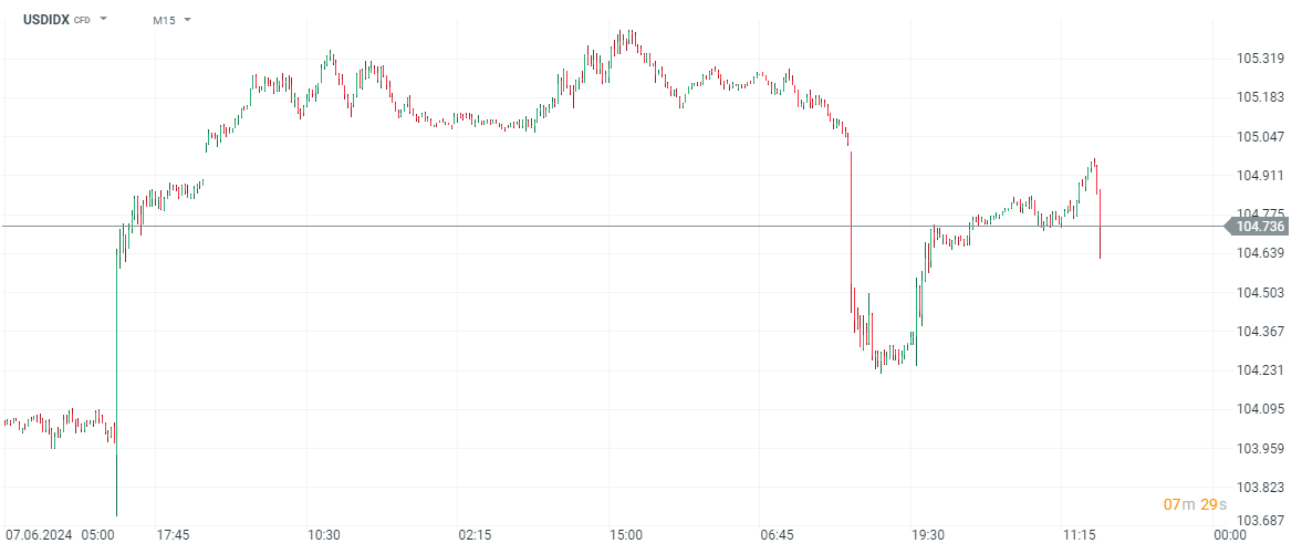Americký dolar po dnešním makročtení ztrácí. Wall Street vidí v dnešních amerických datech šanci na rychlejší snížení sazeb Fedu. Ceny výrobců v USA překvapivě poklesly o -0,2 % m/m vs. 0,5 % dříve a žádosti o podporu v nezaměstnanosti se přiblížily na 250 tis.