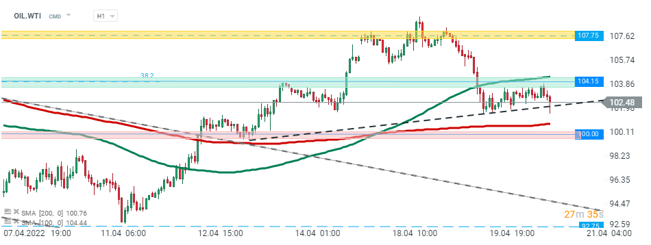 Cena ropy WTI (OIL.WTI) po zveřejnění dnešní zprávy EIA klesla a testuje krátkodobou vzestupnou trendovou linii. Zdroj:xStation5