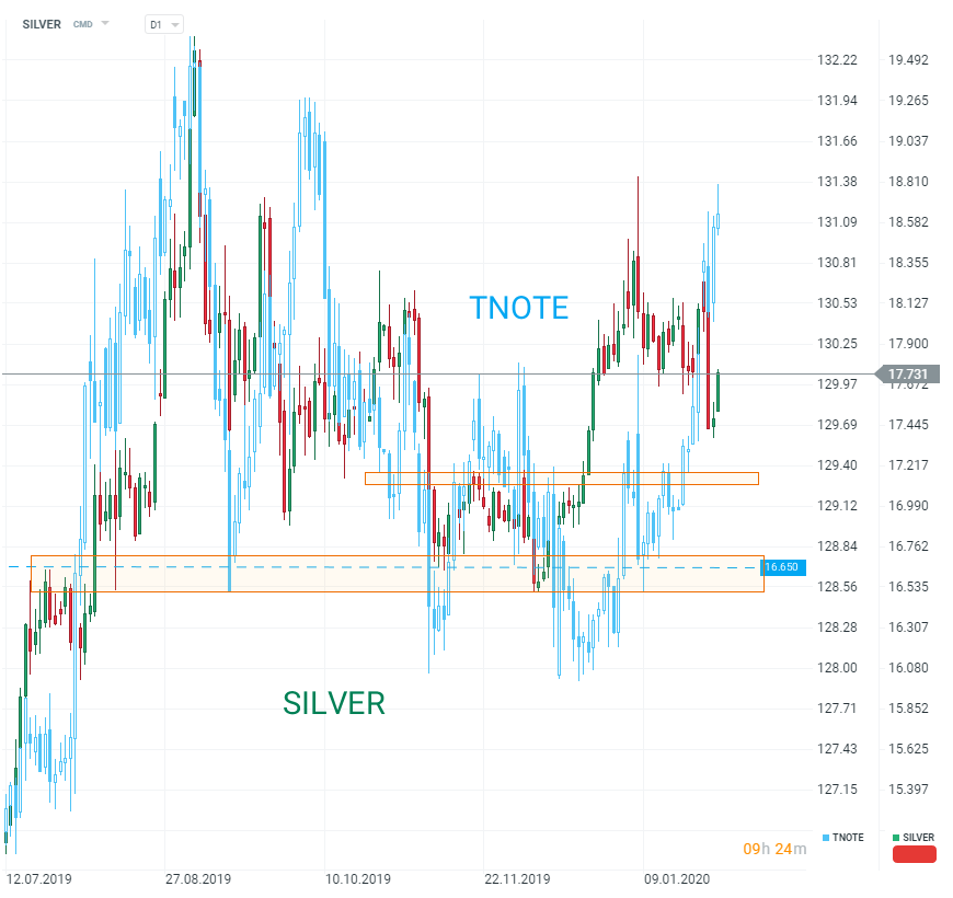 Nízké cenové tlaky by mohlo Fed přinutit k expanzivnější měnové politice, což by mohlo být pozitivní pro drahé kovy. Stříbro likviduje včerejší ztráty. Zdroj: xStation5