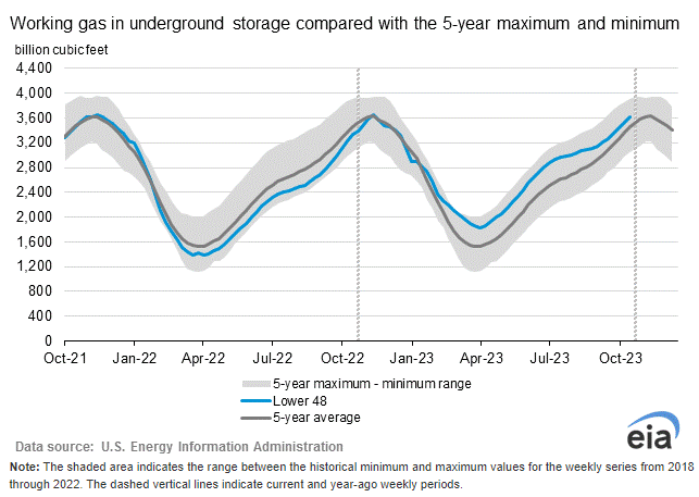 Akcie byly touto dobou o 300 Bcf vyšší než loni a o 175 Bcf nad pětiletým průměrem 3 451 Bcf. Zdroj: EIA