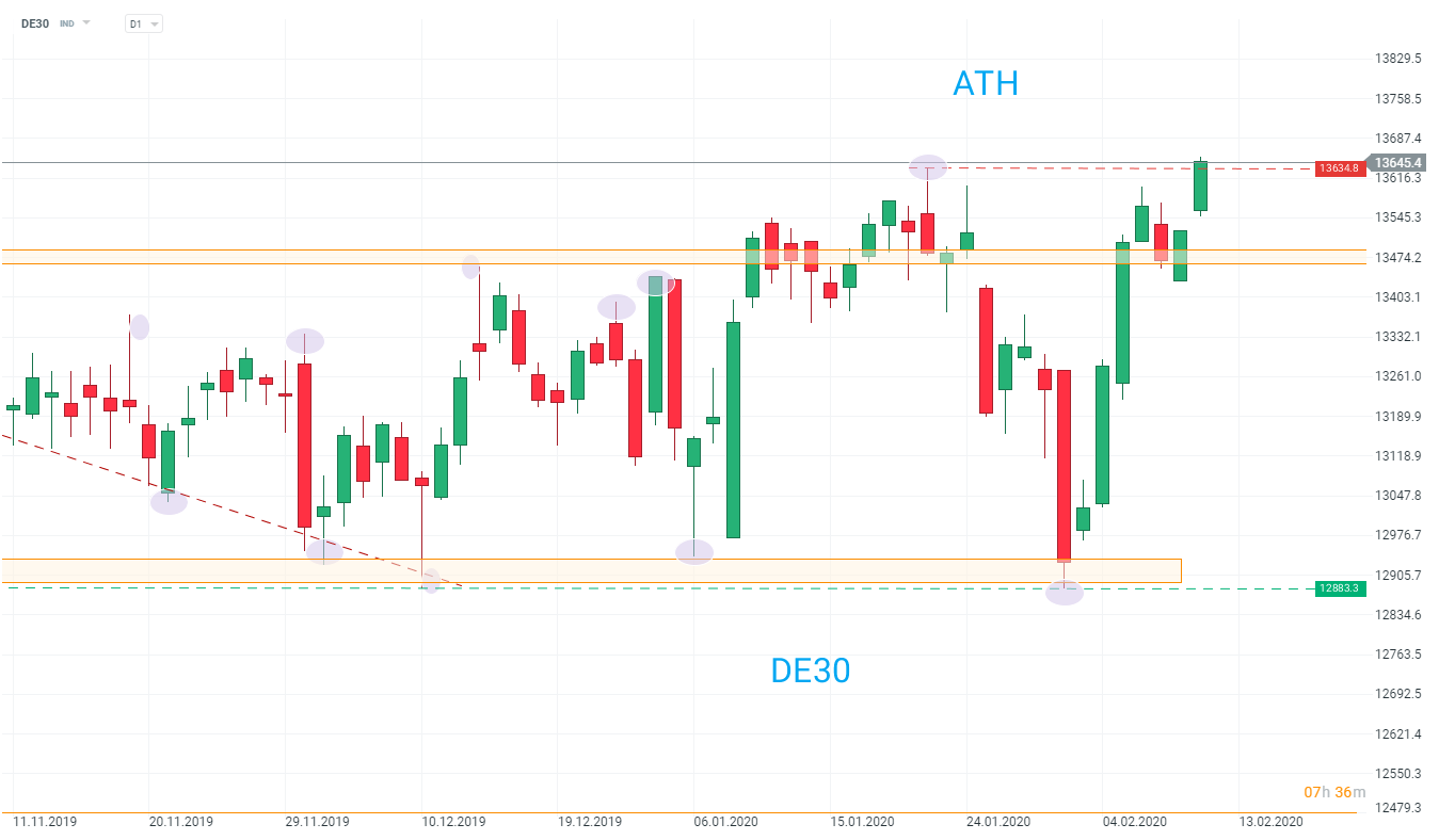 Ďalší silný začiatok obchodovania v USA, keďže US500 a US100 prudko vzrástli na nové historické maximá, čo podporuje aj DE30, ktorý sa dostal na historicky najvyššie úrovne. Za týmto rastom nie sú žiadne kľúčové správy okrem investorov, ktorí v súčasnosti úplne vylučujú riziká z Číny (napriek náznaku, že Peking oneskorí nákupy poľnohospodárskych výrobkov). Investori by mali pamätať na to, že predchádzajúci rekord (22. január) mal krátku životnosť, čo viedlo k výraznému uzatváraniu ziskov.