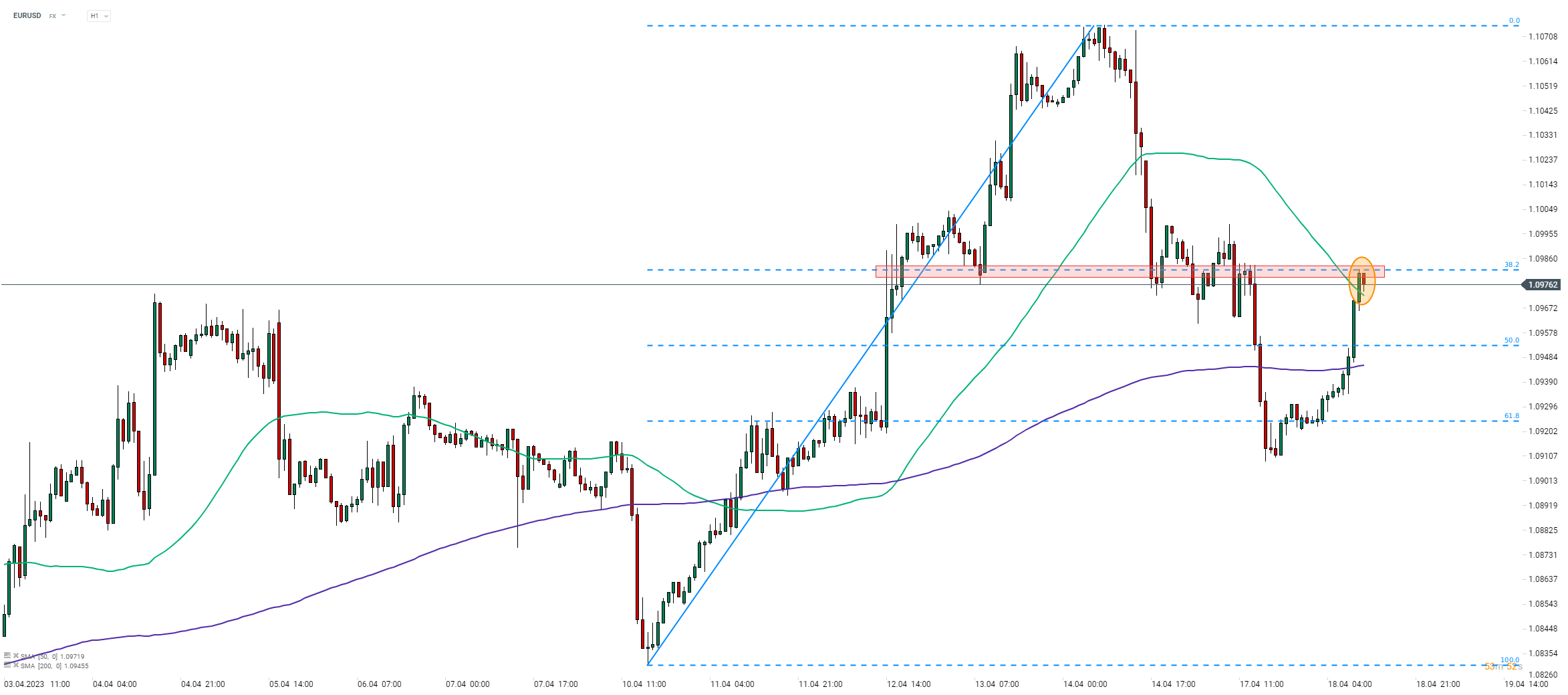 EURUSD klesl po smíšených datech ZEW (oranžový kruh) a stahuje se po neúspěšném pokusu o prolomení nad 38,2% retracement nedávného krátkodobého vzestupného impulsu. Zdroj: xStation5
