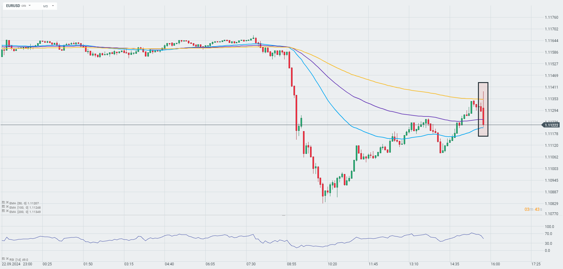 Relativně dobré údaje o PMI ve službách za září vyvolaly oslabení eura vůči dolaru. Trh lepší údaje čte jako menší šanci na holubičí Fed, což podporuje USD. Na druhé straně ovšem na trh doléhá slabá dynamika zpracovatelského průmyslu.