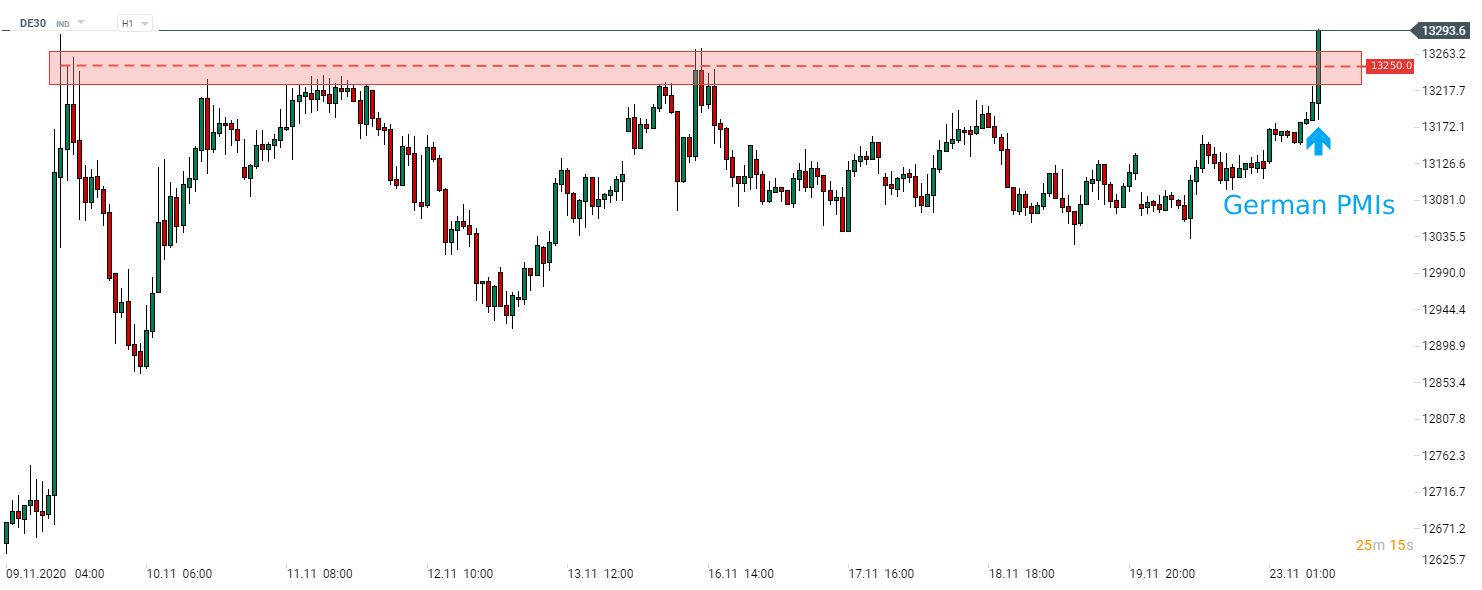 Na francouzské výsledky trhy takřka nereagovaly, ale dobrá data z Německa znamenala růst eura a evropských indexů. DE30 vyskočil nad úroveň 13 250 bodů a EURUSD vzrostl nad 1,1870.