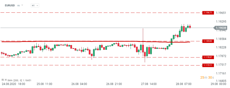 EURUSD zaznamenal relatívne malú reakciu na dnešné zverejnenie údajov. Najobľúbenejší menový pár sa naďalej obchodoval okolo úrovne 1,19. Zdroj: xStation5