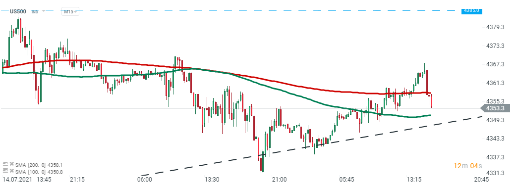 US500 po dnešných zverejneniach dát mierne poklesol a smeruje k stúpajúcej trendovej línii. Zdroj: xStation5