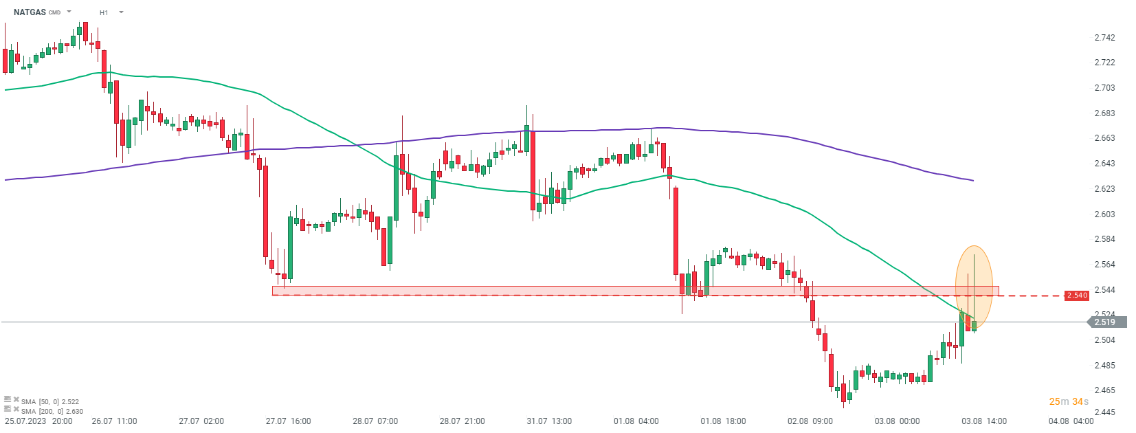 NATGAS po zveřejnění vyskočil a v jednu chvíli se obchodoval až o 1,5 % výše ve srovnání s úrovní před zveřejněním. Tyto zisky však byly rychle vymazány a ceny se později snížily. Při pohledu na graf v intervalu H1 vidíme, že býkům se nedaří cenu vytlačit nad 50-periodický klouzavý průměr (zelená linie).