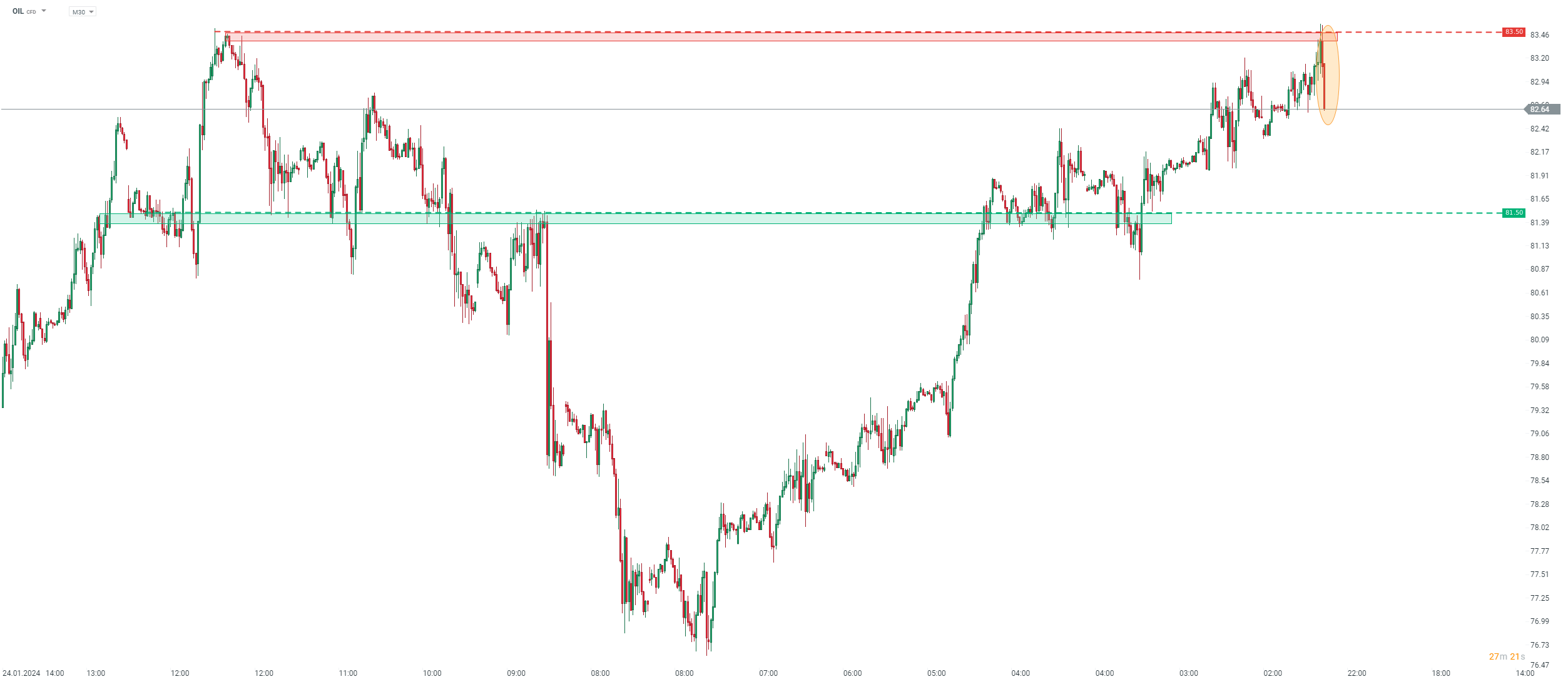 Brent (OIL) prohloubil pokles z rezistence 83,50 dolaru po masivním nárůstu zásob naznačeném týdenní zprávou DOE. Zdroj: xStation5