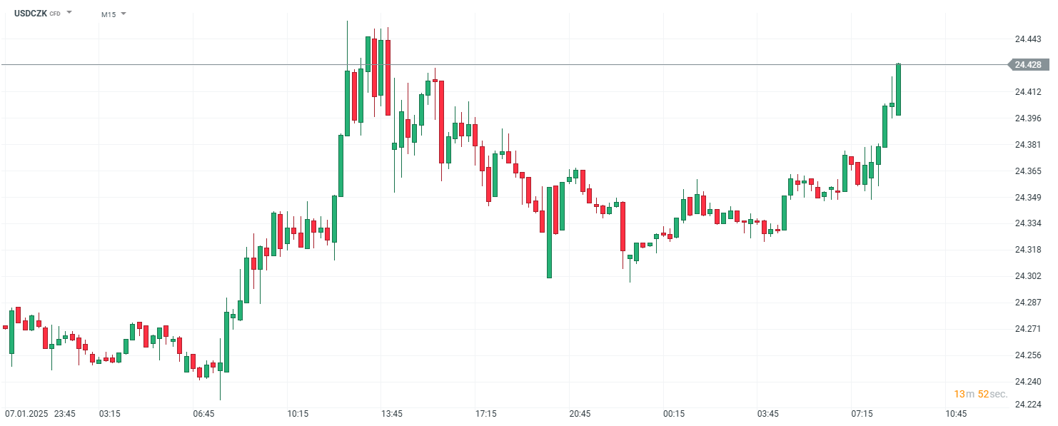 Česká koruna v reakci na to mírně oslabuje, a to o 0,1 % vůči dolaru