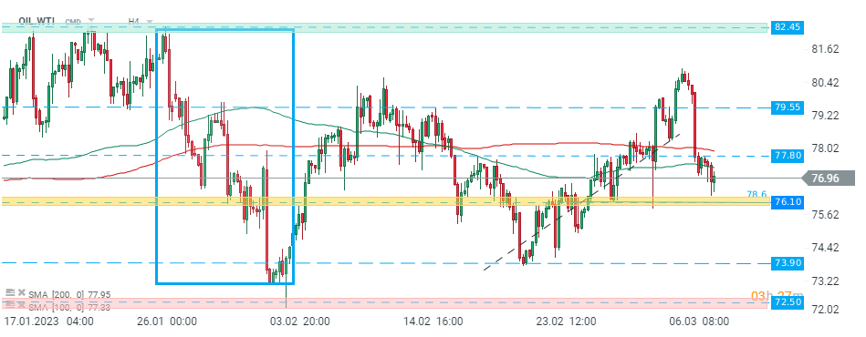 Zveřejnění dnešní zprávy nemělo na ceny ropy zásadní vliv. Ropa WTI (OIL.WTI) se nadále obchoduje pod úrovní 77,00 USD. Zdroj: xStation5