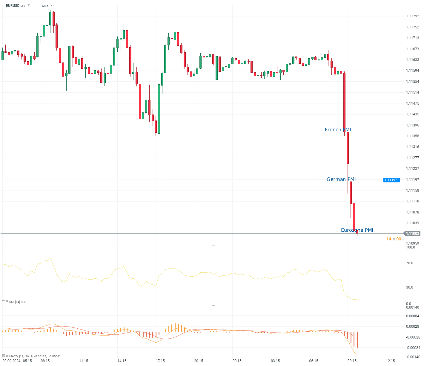 Francouzské údaje dopadly hůře, než se očekávalo - výrobní PMI nenaplnil očekávání, zatímco index služeb vykázal velký pokles, a to z 55 bodů v srpnu na 48,3 bodu v září. Euro a evropské indexy se po zveřejnění propadly.