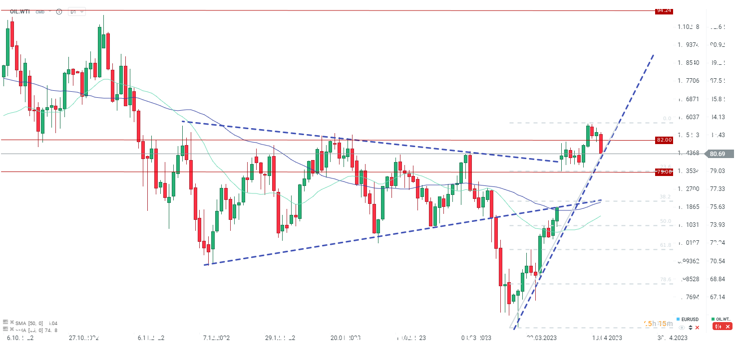 Masivní nárůst ropy WTI. Po otestování 80 USD lze očekávat otestování horní hranice růstové mezery. Zdroj: xStation5