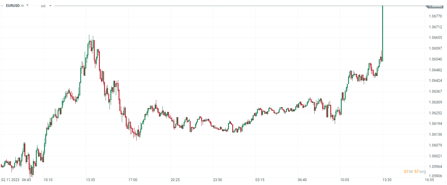Měnový pár EURUSD na příchozí zprávy reaguje silně, protože uvolnění na trhu práce by již mohlo znamenat oficiální konec cyklu zvyšování úrokových sazeb. Růst mezd také ukazuje na měkčí vývoj reálných mezd v USA, což by mohlo do budoucna znamenat nižší spotřebu domácností a také zmírnění tlaku na inflaci. Měnový pár EURUSD je tak po dosavadních výsledcích o 0,35 % výše.