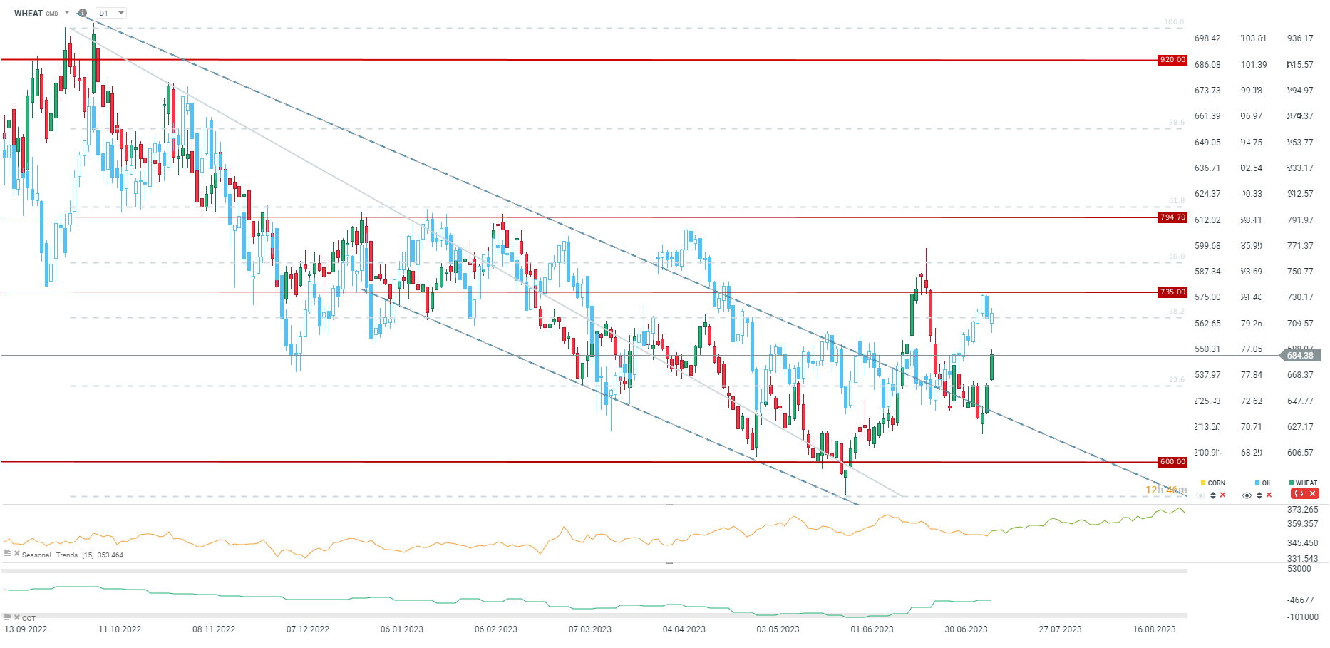 Cena se již tři dny po sobě odráží ode dna. Sezónnost naznačuje další růst, přinejmenším do poloviny příštího měsíce. Pokud Rusko nerozhodne o nové dohodě, další významná úroveň odporu se nachází v rozmezí 700-710 centů za bušl. Zdroj: xStation5.
