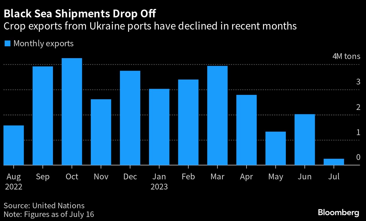 Ukazuje se, že množství obilí vyváženého po moři z Ukrajiny se v červenci výrazně snížilo. Částečně je to způsobeno sezónními faktory, ale na druhé straně Rusko ztěžuje vývoz tím, že prodlužuje dobu inspekcí a nereaguje na nové žádosti o nakládku. V poslední době bylo podáno 29 takových žádostí o vývoz do 17. července, ale na tyto žádosti nebylo nijak reagováno.