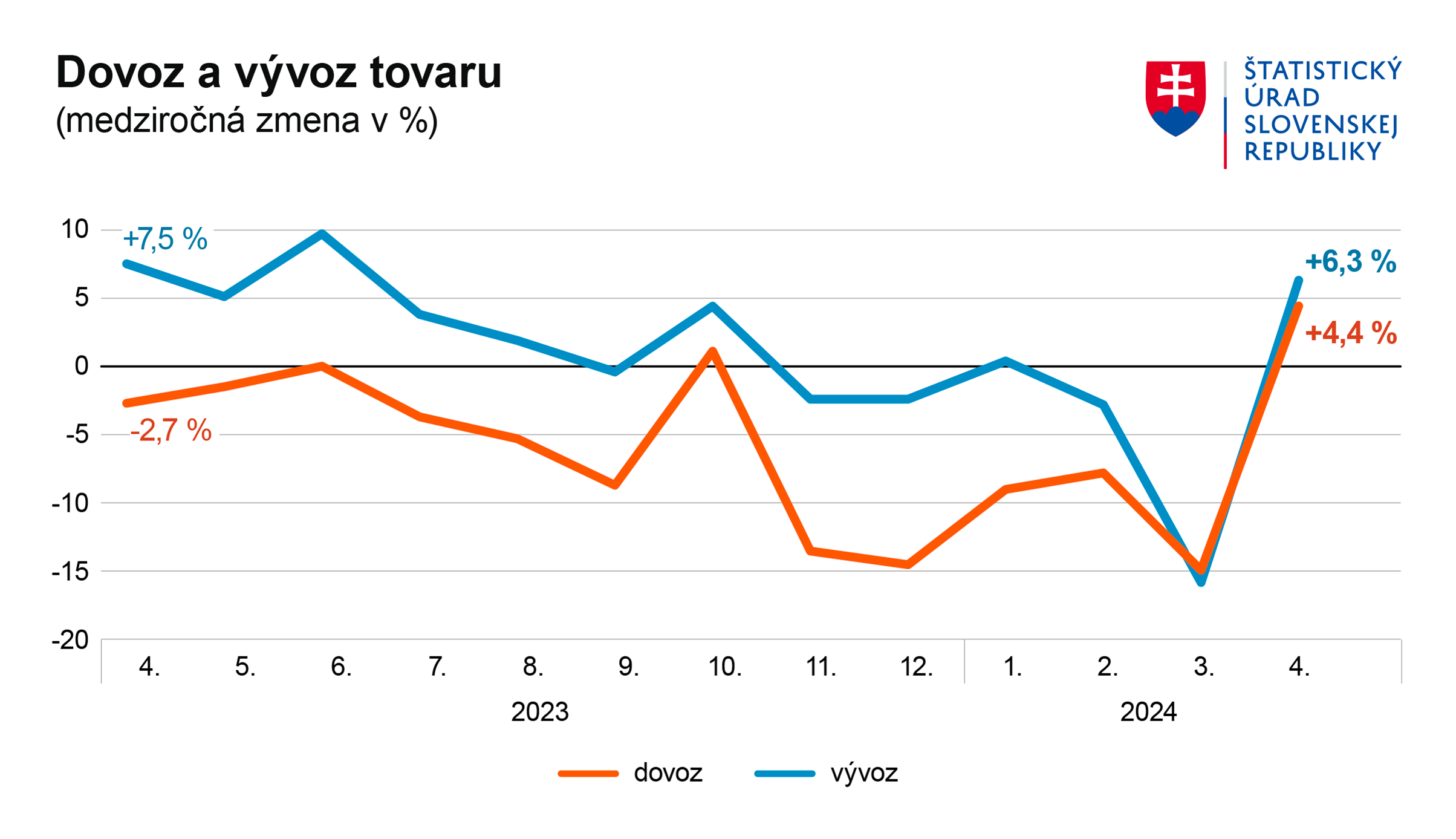 Po dvou neúspěšných měsících se slovenský vývoz opět překlopil do meziročního růstu. Hodnota vývozu dosáhla v dubnu 9 mld. eur, což představuje meziroční růst o 6,3 %. Takový růst byl nejvýraznější od června 2023 a byl způsoben především vyšším vývozem automobilů do zahraničí.