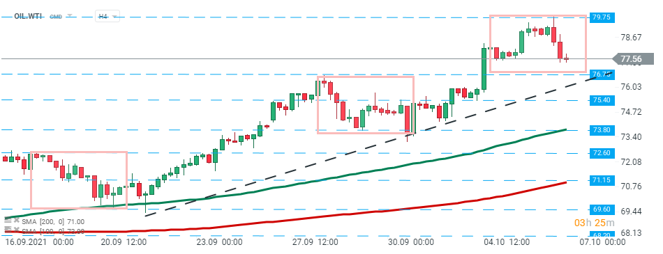 Zveřejnění zásob nemělo výrazný dopad na cenu ropy. WTI Oil (OIL.WTI) pokračuje v obchodování okolo úrovně $77,50. Zdroj: xStation5