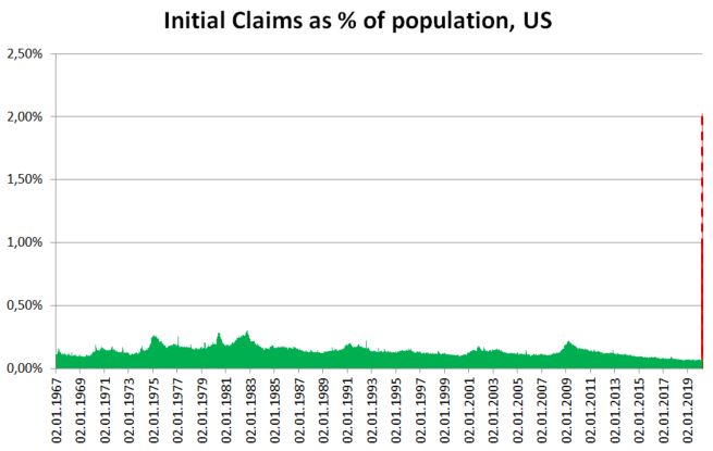 Dnešné dáta naznačujú, že o prácu prišlo viac ako 2% americkej populácie. Zdroj: XTB Research