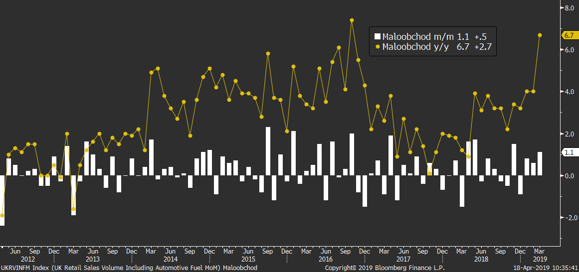 Velká Británie dnes zveřejnila výsledky maloobchodu, které dokázaly příjemně překvapit. Meziměsíčně rostly tržby v březnu o 1,1 %, což bylo výrazně nad většinovým konsenzem, který počítal s pádem o 0,3 %. Meziročně tržby v maloobchdou rostly dokonce o 6,7 %, což je prudké zrychlení z únorových 4 %. Tržby tak rostou solidním tempem již třetím měsícem v řadě a britská ekonomika se navzdory vidině brexitu dál docela drží. Obzvláště pak v kontrastu s tím, jaká data poslední dobou přicházejí z kontinentální Evropy.
